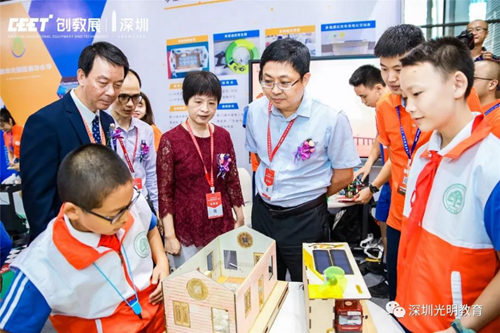 區高級中學新星星創客實踐室無人機航拍隊和開源硬件、東周小學學生創客作品《語音識別防溺水游泳眼鏡》與《語音識別公交車司機呼救座椅》、愛華小學學生創客作品《多電源公交車充電公交站牌》與《新型救生圈》、光明小學電子班牌管理系統和艾路摩多媒體教學儀得到了深圳市教育局副局長趙立、深圳市教育信息技術中心主任張惠敏、深圳市教育裝備行業協會會長彭錦環等領導嘉賓、與會觀眾的密切關注和大家贊賞,彰顯了光明區科技創客教育的豐富成果和現代教育技術在教學中的廣泛應用。