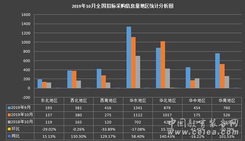 地區數據結果表明:10月份各地區招標采購信息量與去年同期相比,除華中地區外,其他地區均呈現大幅增長趨勢,與上月相比,除華北地區,其他地區均有不同程度的下降。省份當中,河北、北京,廣東、福建、山東等省份的招標采購信息量較高。地區數據的不同主要由來自地區經濟、教育政策、教育投入等因素的影響。