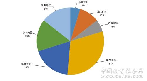 從10月中標信息地區統計圖(如圖8所示)和全國中標信息地區占比圖(如圖9所示)來看:華東地區中標信息量為865條,占比31%;華北地區中標信息量為521條,占比19%;華中地區中標信息量為430條,占比15%;華南地區中標信息量為402條,占比14%;西北地區中標信息量為270條,占比10%;西南地區招中標信息量為164條,占比6%;東北地區中標信息量為132條,占比5%。