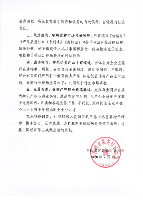 中國教育裝備行業(yè)協(xié)會(huì)關(guān)于疫情防控期間堅(jiān)決維護(hù)市場(chǎng)秩序的倡議書
