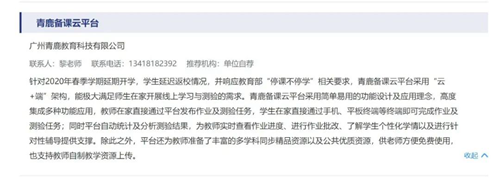 平臺一經發布,就受到了廣大 高校、院所及科技企業的積極響應。據悉平臺已 征集到超過2000件新技術新產品。經一系列嚴格地分類篩選后,目前有544件符合市場準入規定、創新水平高、知識產權明晰、應用價值大、示范效應強的創新技術產品符合相關標準,被推介向全社會。青鹿備課云平臺(現已更名“青鹿智慧課堂云平臺”)從眾多新技術新產品中脫穎而出,入選第二批“抗疫先進技術成果”。