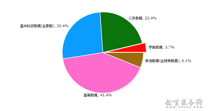 根據6月份教育裝備招標采購信息量所屬領域統計圖(見圖6)可以看出:高等教育招標采購信息量占比最大,占全部信息量的41.4%;學前教育招標采購信息量占比最小,占全部信息量的3.7%。其他高中階段教育(含職教)招標采購信息量占全部信息量的26.4%,義務教育招標采購信息量占全部信息量的22.4%,其他教育(含特殊教育)招標采購信息量占全部信息量的6.1%。