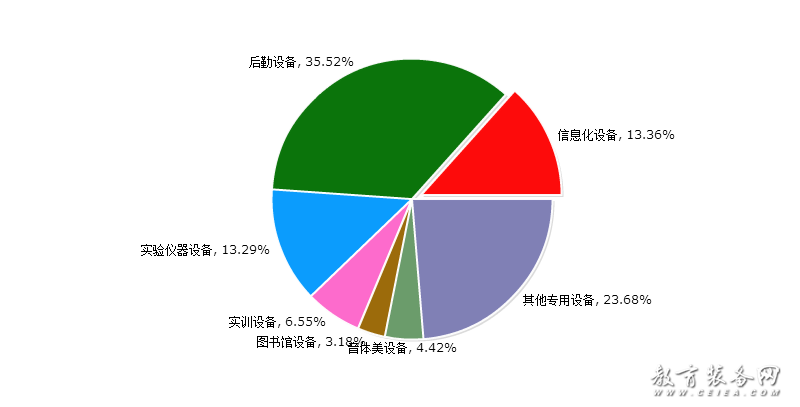 根據對教育裝備細分的歸納,教育裝備網將教育裝備具體劃分為七大類,即信息化設備(含智能平板、錄播系統、智慧黑板等),后勤設備(含校園基建、安防設備、食堂設備、課桌椅等),實驗儀器設備(含儀器儀表、實驗室平臺等),實訓設備(含實訓系統、實訓設施等),圖書館設備(含借還系統、微型圖書館等),音體美設備(含樂器、體育設施、美術用品等),其他專用設備(含創客教育、心理健康特教設備等)。