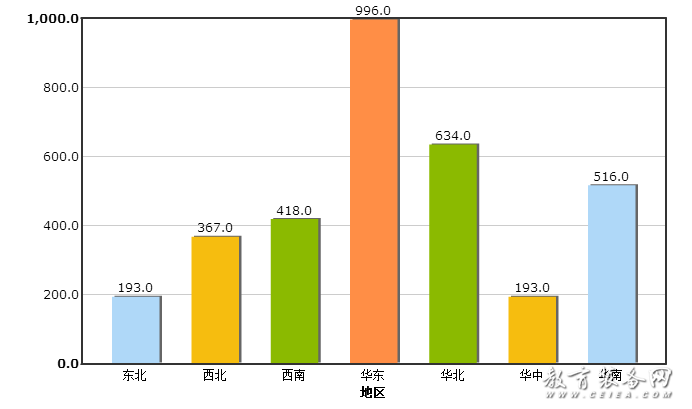 根據(jù)9月份收集到的教育裝備招標(biāo)采購信息(見圖2、圖3):教育裝備招標(biāo)采購區(qū)域信息數(shù)據(jù)共3317條(招標(biāo)采購信息地區(qū)設(shè)置為單選項(xiàng))。其中,華東地區(qū)招標(biāo)采購信息量996條,占區(qū)域信息量的30.03%;華北地區(qū)招標(biāo)采購信息量634條,占區(qū)域信息量的19.11%;華南地區(qū)招標(biāo)采購信息量516條,占區(qū)域信息量的15.56%;西南地區(qū)招標(biāo)采購信息量418條,占區(qū)域信息量的12.60%;西北地區(qū)招標(biāo)采購信息量367條,占區(qū)域信息量的11.06%;東北地區(qū)、華中地區(qū)教育裝備招標(biāo)采購信息量均為193條,占區(qū)域信息量的5.82%。