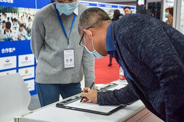 每位進(jìn)過(guò)展位的來(lái)賓都會(huì)停下腳步,向在場(chǎng)的工作人員詢問(wèn):“這個(gè)(智能手寫板)怎么在課堂上使用呀?”講師熱情地邀請(qǐng)來(lái)賓體驗(yàn)紙筆互動(dòng)課堂,將作業(yè)放在智能手寫板上,用筆隨意在紙上書寫,書寫的內(nèi)容呈現(xiàn)在屏幕上,筆跡完整還原。