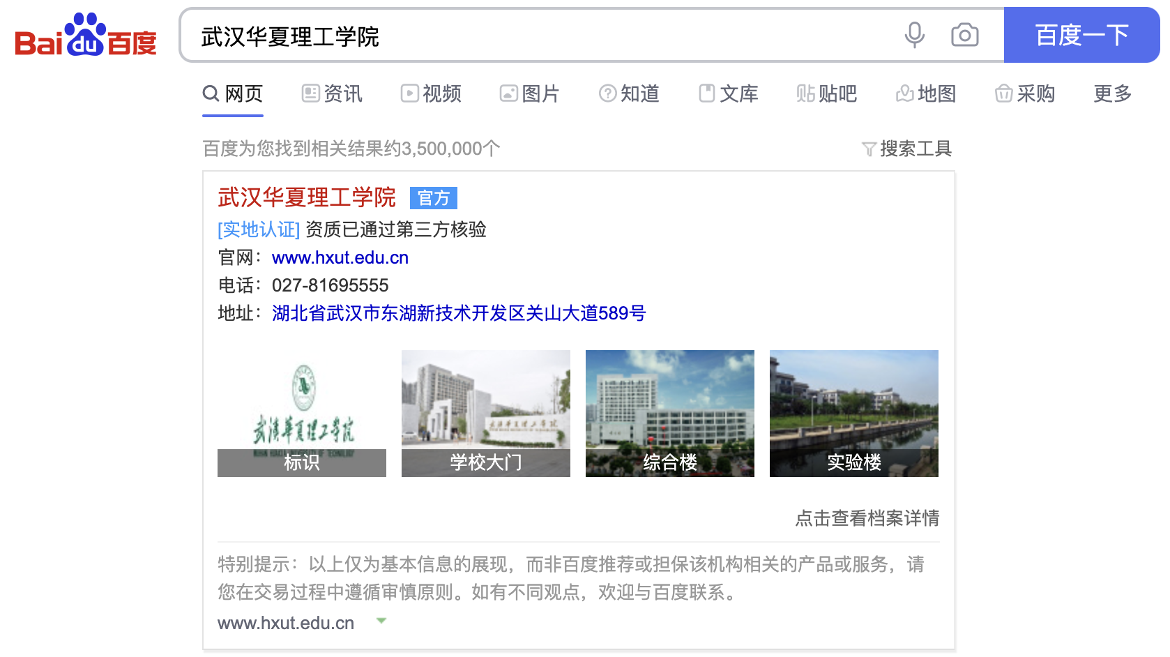 “武漢華夏理工學(xué)院”的百度認(rèn)證結(jié)果展示頁(yè)