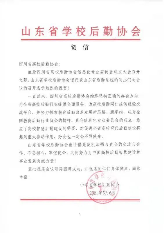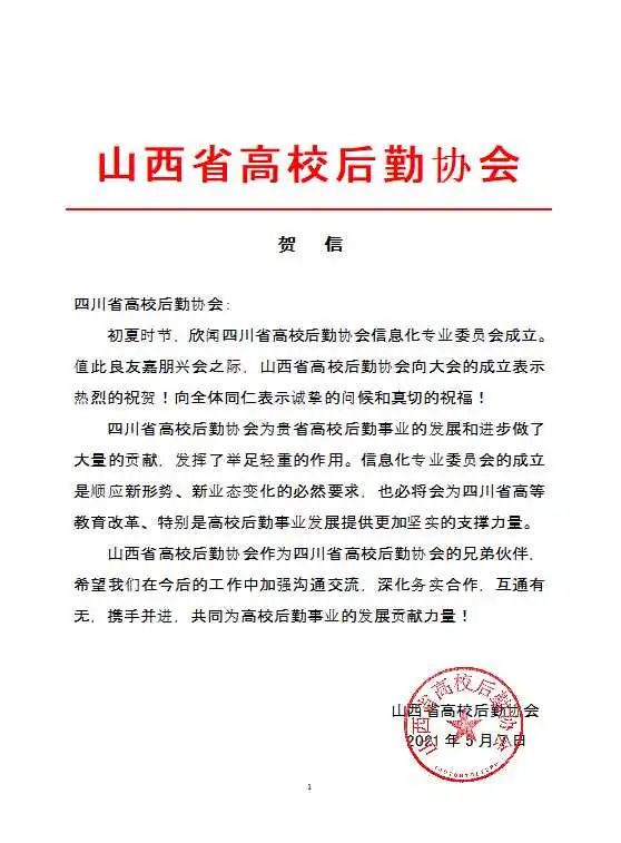 江蘇省、山東省、廣東省、山西省等學校(高校)后勤協會也對四川省高校后勤協會信息化建設專業委員會的成立發來賀電賀詞。