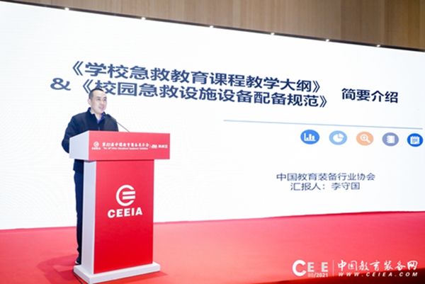 中國教育裝備行業協會李守國在會上介紹了《校園急救設施設備配備規范》的編制情況,并代表全國校園急救教育試點工作辦公室正式發布了《學校急救教育課程教學大綱(試行)》。
