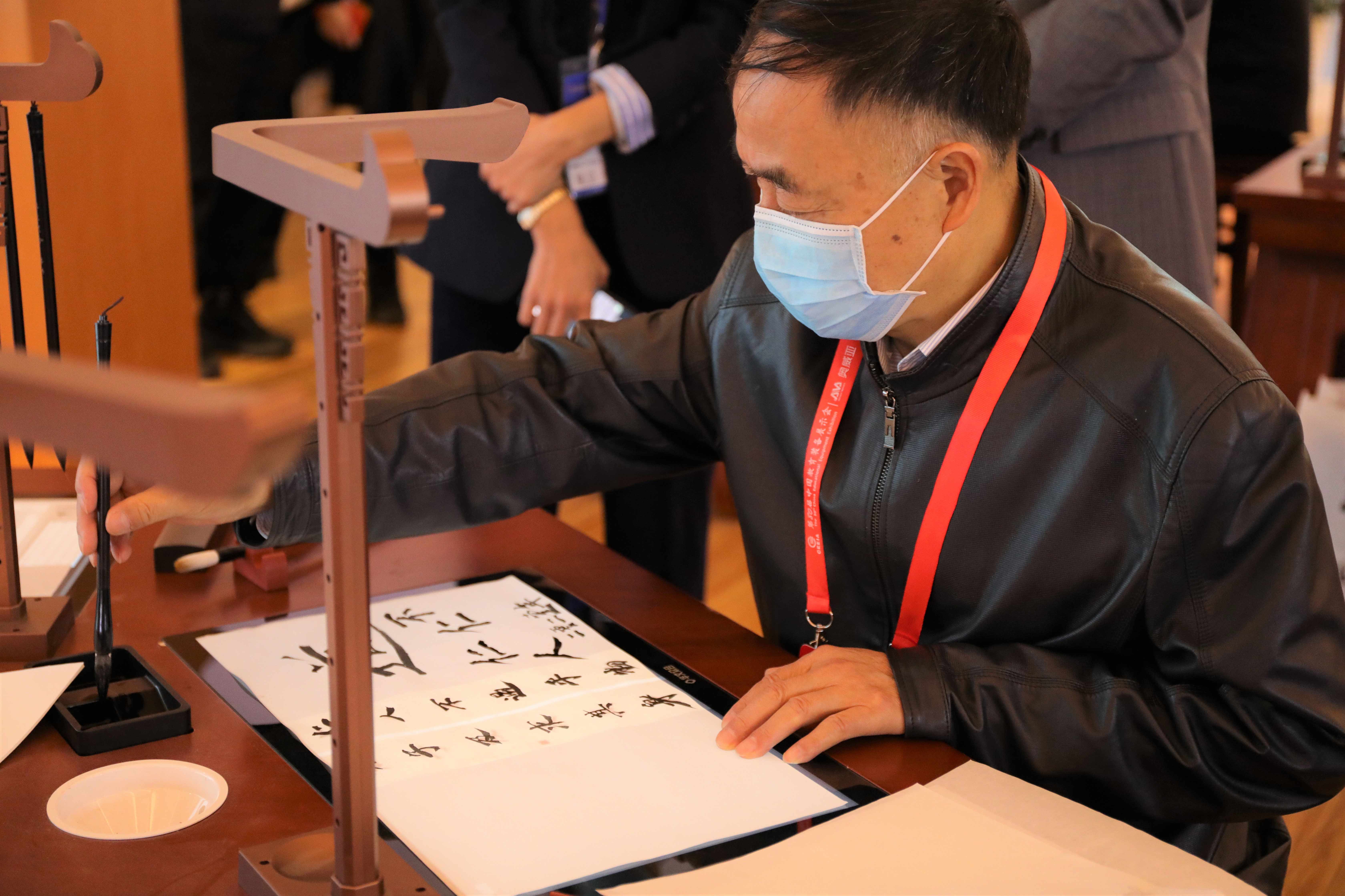 中國教育裝備行業(yè)協(xié)會未來教育裝備分會理事長葉寶凌體驗智慧書法教室