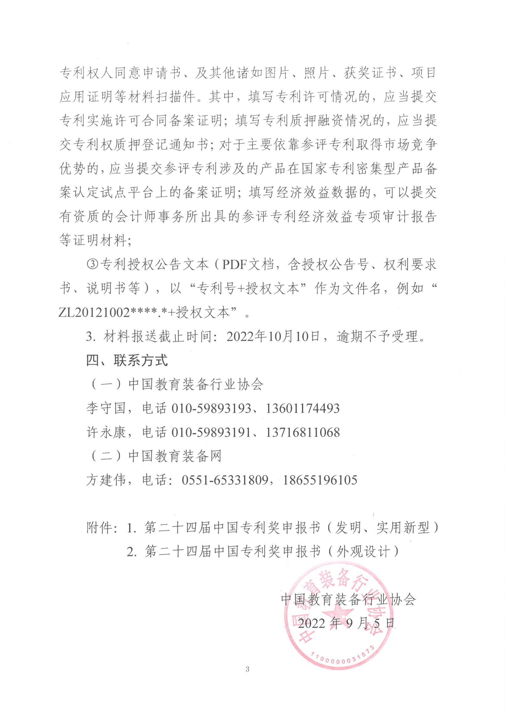 近日,國家知識產(chǎn)權(quán)局發(fā)布《關(guān)于評選第二十四屆中國專利獎的通知》(國知發(fā)運函字〔2022〕134號),國家知識產(chǎn)權(quán)局和世界知識產(chǎn)權(quán)組織共同開展第二十四屆中國專利獎評選工作。為鼓勵和表彰為教育裝備技術(shù)(設(shè)計)創(chuàng)新及教育裝備行業(yè)發(fā)展做出突出貢獻的會員單位,中國教育裝備行業(yè)協(xié)會(以下簡稱“中教協(xié)”)作為中國專利獎推薦單位,擬組織“第二十四屆中國專利獎”申報工作,并擇優(yōu)推薦,F(xiàn)將有關(guān)事項通知如下: