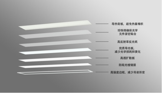 宜美照明優(yōu)選7種材料,采用科學(xué)設(shè)計,從根源解決健康照明問題。在燈具底層,使用了導(dǎo)熱背板,可避免熱量堆積,減少安全隱患;背板上,珍珠棉能確保光學(xué)元件緊密貼合,防止光線漏出;然后是高反射率反光紙,可在增加光源利用率的同時,減少眩光的產(chǎn)生;在LED燈珠下,使用優(yōu)質(zhì)導(dǎo)光板,可減少光學(xué)損耗和黃化;在導(dǎo)光板下,還采用高透擴散板和防眩光棱鏡層,可有效減少眩光的形成;燈具外還采用高強度邊框,可減少吊裝變形,延長使用壽命。