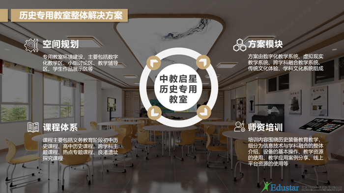 中教啟星歷史專用教室由空間規劃、方案模塊、課程體系及師資教學應用培訓構成。