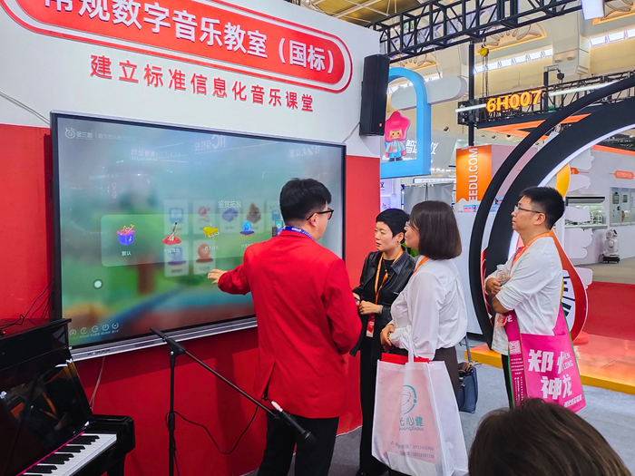 金三惠展位熱鬧非凡,觀眾絡繹不絕。金三惠通過產品展示以及專業的講解,讓現場觀眾感受到在數字化、智能化的賦能下,音樂教育的飛速發展,金三惠以提供優質資源和營造良好創新氛圍為基準,建設未來音樂教學新體驗,讓學生和老師都能更輕松的上好、上懂音樂課。