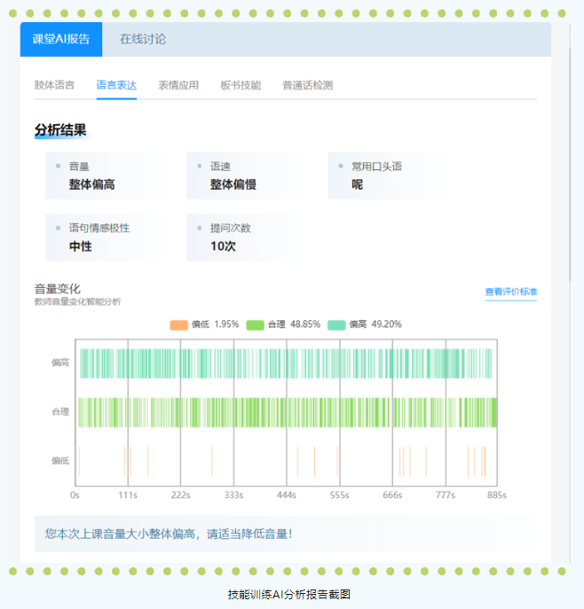 2.語言表達分析:基于教學中采集的音頻,實時呈現(xiàn)音量、語速變化;分析教學過程中語言表達的情感極性和可理解性;識別用戶常用口頭語并提供頻率排序等。
