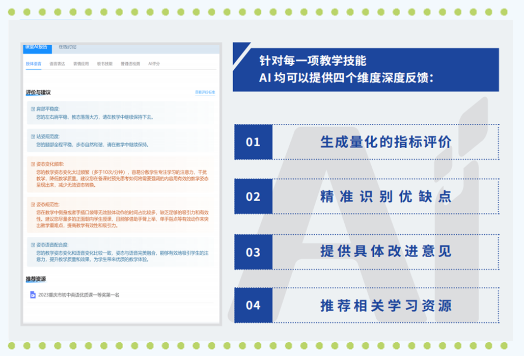 針對每一項技能指標,AI均可提供評價、優(yōu)缺點、改進意見、推薦學習資源四個維度的深度反饋,有力推動訓練師生的靶向改進與持續(xù)提升。