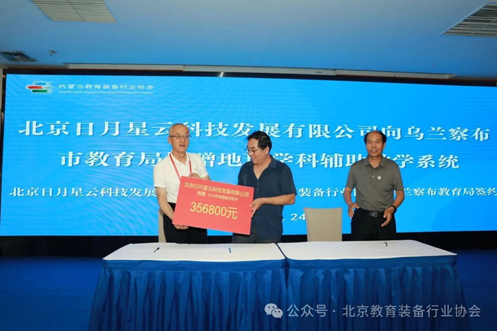 在全場(chǎng)嘉賓的見(jiàn)證下,相關(guān)代表鄭重簽署捐贈(zèng)協(xié)議,定格京蒙攜手助力教育發(fā)展的重要瞬間。北京教育裝備行業(yè)協(xié)會(huì)和會(huì)員企業(yè)共計(jì)捐贈(zèng)103.41萬(wàn)元,其中北京教育裝備行業(yè)協(xié)會(huì)捐款 20 萬(wàn)元,北京中教啟星科技股份有限公司捐贈(zèng)教學(xué)儀器及教學(xué)軟件一批23.63萬(wàn)元,北京金三惠科技有限公司捐贈(zèng)音樂(lè)教學(xué)設(shè)備一批24.1萬(wàn)元,北京日月星云科技發(fā)展有限公司捐贈(zèng)中小學(xué)地理教學(xué)軟件一批35.68萬(wàn)元。
