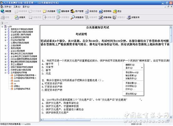 試題庫系統是一套基于C/S模式的試題與試卷管理系統,可以在網絡或單機條件下運行,支持AccessSql ServerAccess多種數據庫,該系統可以完成從試題建立、識題屬性設置、知識點建立、試題錄入或批量導入、試題查詢、組卷到試卷管理全部試題管理過程。系統支持將各種版本的word文檔編制的題目批量轉換入庫,支持圖片及各種特殊學科符號編輯和錄入,全面兼容word的編輯和排版功能,支持插入EXCELPPT、圖片等文檔。還可以與考試系統接口,將試卷直接設置到考試系統中進行無紙化考試。該系統主要功能如下: