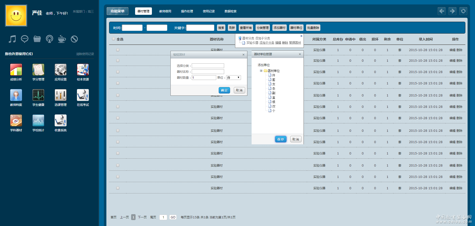 器材管理 實現(xiàn)對器材分類、類型、基本情況等器材信息的綜合管理。 器材借用 對器材使用班級、使用時間、使用教師等器材借用信息的綜合管理。 器材歸還 對器材歸還的時間、保管情況等信息的記錄。 操作記錄 對器材的錄入、刪除、借還等操作類信息的綜合性記錄。 使用記錄 對各類器材使用情況的匯總記錄。 |