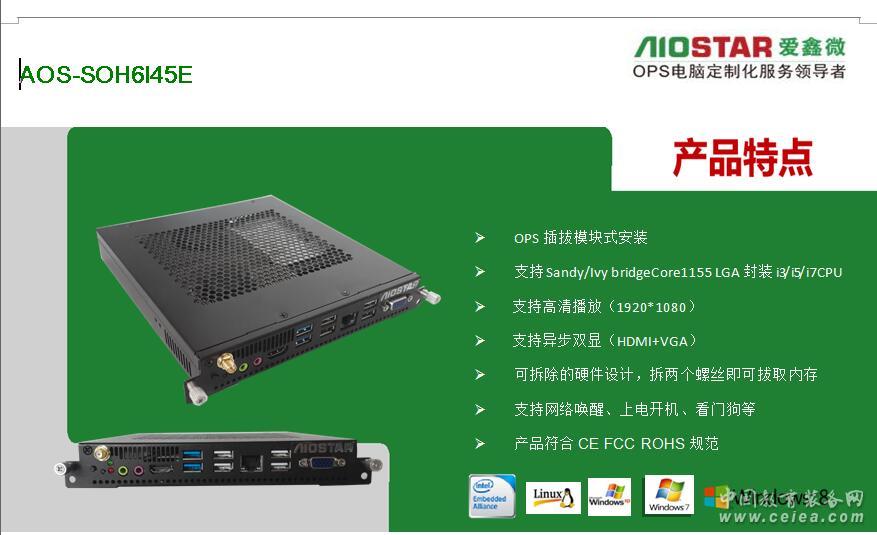產(chǎn)品詳細介紹深圳市愛鑫微電子有限公司為更好的配合不同廠家的要求,可提供OPS主板與OPS準系統(tǒng)的方案配合各個廣告機,觸控一體機廠家,多媒體壁掛式教學一體機,數(shù)字標牌,錄播觸控一體機,同時保證所提供OPS主板與OPS插拔式電腦/OPS-C插拔式電腦主機是完全按照INTEL OPS規(guī)范定義的,完全支持鴻合教育一體機、東方中原教育一體機、創(chuàng)維教育一體機、康佳教育一體機、中銀液晶觸控一體機、中電數(shù)碼教育一體機、海爾觸控一體、TCL觸控一體機、KTC/HKC/HPC等各大交互式教育觸控一體機廠家,愛鑫微電子提供專業(yè)的定制化服務(wù)OEM/ODM. 聯(lián)系電話:18620397178 QQ:46078934 現(xiàn)階段我司已推出了一系列OPS電腦方案如下: 頂極OPS插拔式電腦方案:H110+6代CPU+2G獨立顯卡(GT730/GT850/GT950) 高端:H110+6代CPU (市場最新方案 4K極清方案)歡迎客戶取樣測試。支持4組USB3.0+3組USB2.0+3組異步顯示(VGA+HDMI+DP)+3組網(wǎng)口(可以直接接IP攝像機進行錄播與監(jiān)控或者網(wǎng)絡(luò)內(nèi)外網(wǎng)隔離進行封標) 中高端:H81+4代CPU/HM86+4-5代CPU(市場主流) 中端:H61+2-3代CPU/HM65+2-3代CPU(高性價比) 低端:baytrailJ1800/J1900無風扇低成本的OPS電腦(幼教觸控一體機專用) 深圳市愛鑫微電子有限公司(以下簡稱“AIOSTAR”)是一家集研發(fā)、生產(chǎn)和銷售于一體的高新技術(shù)企業(yè),同時是Intel、AMD、NVIDIA等芯片廠商緊密的合作伙伴。公司主營工業(yè)主板(ITX/3.5寸/NANO等)、媒體播放主機、OPS主機、OPS可插拔式電腦模塊、OPS主板、BOX-PC、網(wǎng)絡(luò)安全硬件平臺、服務(wù)器、工業(yè)平板電腦、一體化工作站等產(chǎn)品。目前,產(chǎn)品已廣泛應(yīng)用于DS、MIDS、IWB、POS、自助查詢、零售金融、工業(yè)自動化,智能交通,網(wǎng)絡(luò)信息安全,通訊、智能安防,云計算、石油石化、醫(yī)療、軍事裝備等多個領(lǐng)域。公司高度重視客戶的需求和滿意度,針對不同的客戶需求,能夠快速做出積極的響應(yīng),為其進行量身設(shè)計并提供個性化的OEM/ODM服務(wù)。 愛鑫微電子本著以“人才是企業(yè)的財富,效益是追求的目標,發(fā)展是永恒的主題”為宗旨;以“客戶至上,品質(zhì)為尊“為原則;提倡“博愛”“齊鑫”“微天下”的意愿,愿與全球各地的企業(yè)商家攜手合作,共謀發(fā)展! 規(guī)格參數(shù) 處理器 CPU Intel英特爾 Core酷睿 i3-3220 (雙核四線程/3.3GHz/3MB三級緩存/HD2500/22nm/54W/LGA1155) 芯片組 Intel® H61/B75 BIOS AMI 32Mbit,支持無盤啟動、網(wǎng)絡(luò)喚醒、上電開機、看門狗等功能 內(nèi)存 容量 4GB SO-DIMM DDR3 1333 MHz memory , Max.8GB 存儲 SATA接口 MINI PCIE 2.5〞5400rpm 500G 1xMini PCIE 顯示 芯片組 輸出