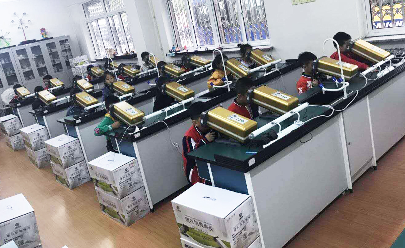 兒童青少年每天大部分時(shí)間在學(xué)校度過,通過狠抓落實(shí)校園近視防控,才能為教育新發(fā)展新跨越開好局、起好步、奠好基,才能讓全國近視防控工作有突破性進(jìn)展。永康學(xué)生近視防控教室,拿出一間教室,放置30-50臺(tái)永康視力提升機(jī),學(xué)生按班級(jí)建制每周進(jìn)行一次20-40分鐘的訓(xùn)練,一般經(jīng)過1-2個(gè)月5-10次訓(xùn)練,會(huì)達(dá)到裸眼視力平均提升2行,近視率平均下降10%以上的良好效果。這間教室,適用于所有學(xué)生。不近視的學(xué)生,經(jīng)常參加訓(xùn)練,可以預(yù)防近視的發(fā)生;近視的學(xué)生,通過視力提升訓(xùn)練,能夠控制近視度數(shù),提升視力。