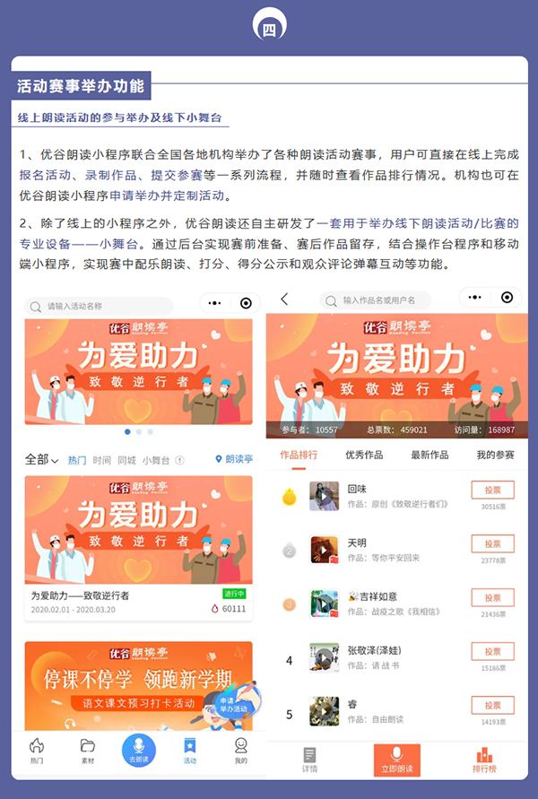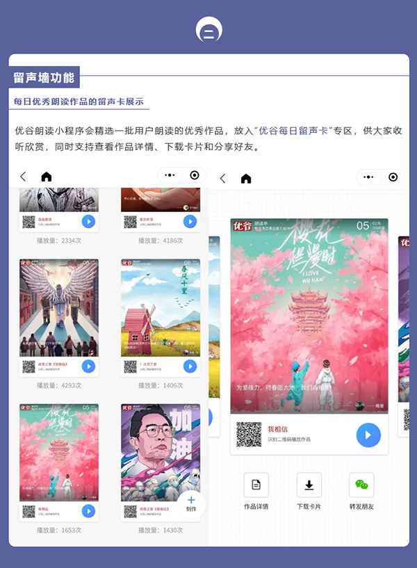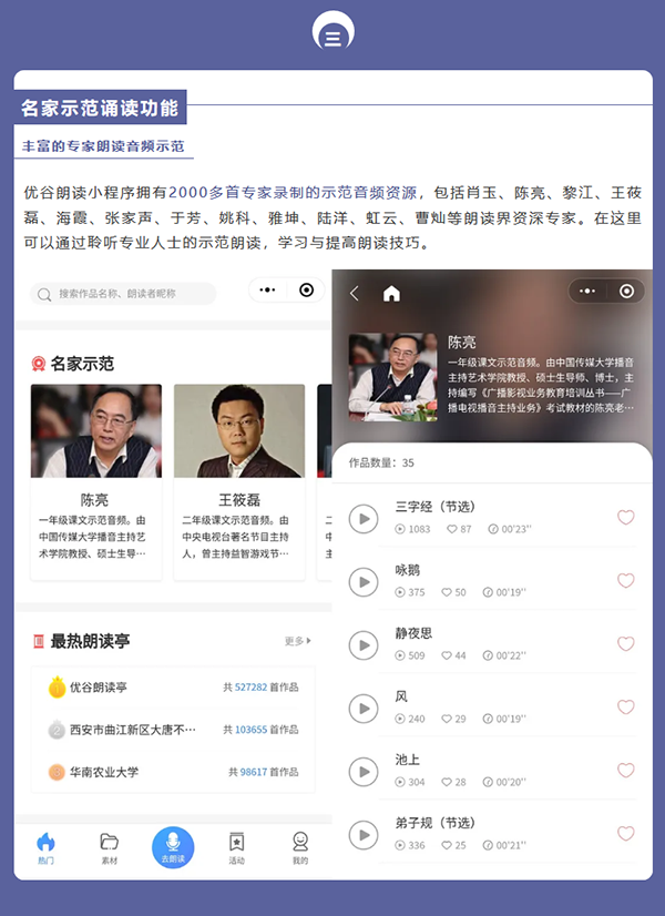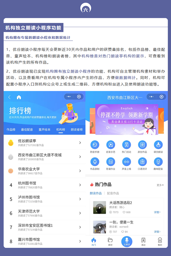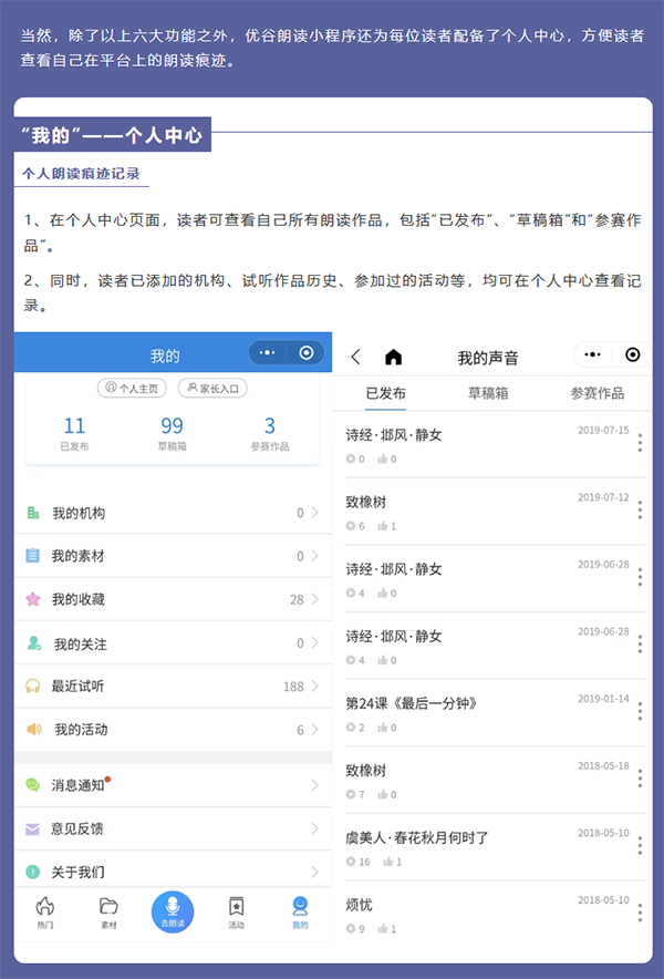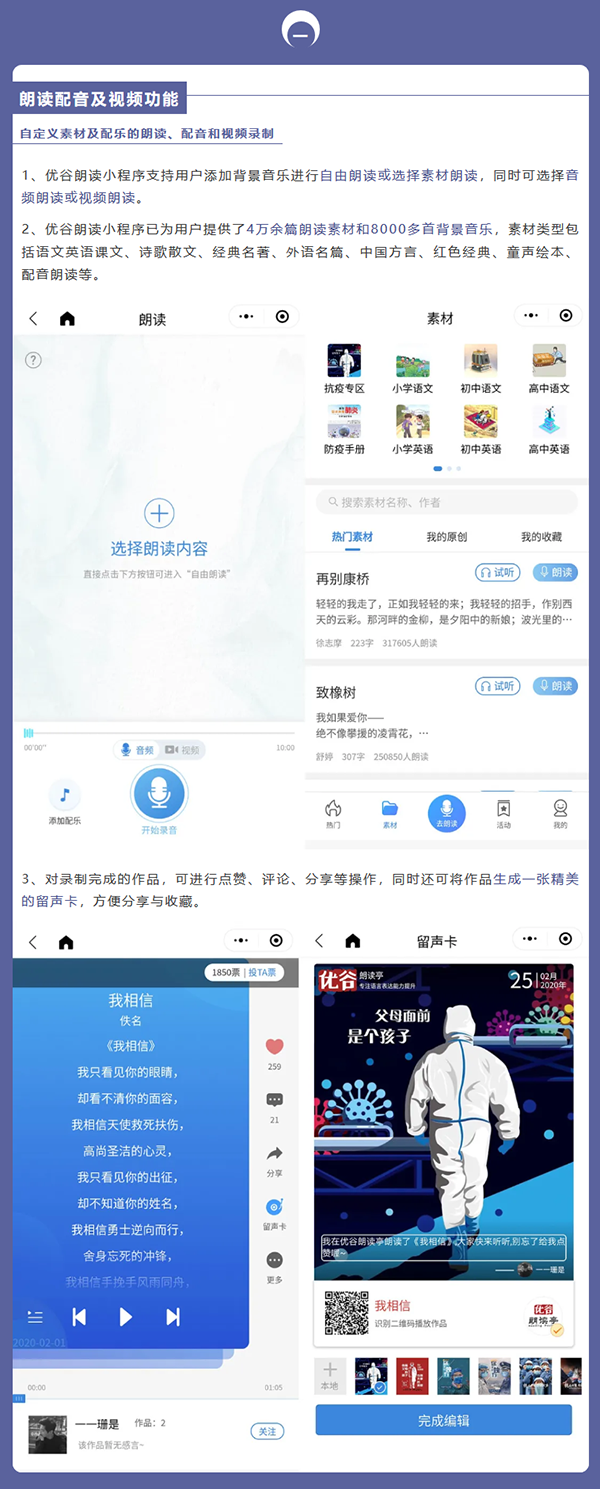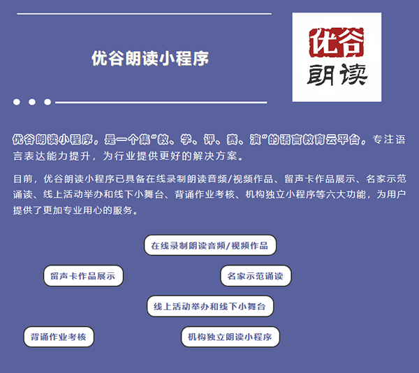 目前,優(yōu)谷朗讀小程序已具備在線錄制朗讀音頻/視頻作品、留聲卡作品展示、名家示范誦讀、線上活動(dòng)舉辦和線下小舞臺(tái)、背誦作業(yè)考核、機(jī)構(gòu)獨(dú)立小程序等六大功能,為用戶提供了更加專業(yè)用心的服務(wù)。