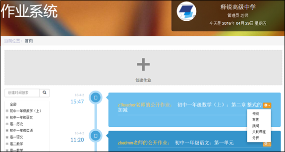 作業系統就是一個管理課后學習任務的系統,提供教師版和學生版兩種界面;教師利用該系統來創建、引用、布置和批閱作業,而學生則能利用該系統按時接收教師布置的學習任務并及時上交作業;在教師創建作業時,系統自動生成了全校共享乃至全區共享的作業庫,以實現更加智能化的作業管理,提高作業資源的重復利用率,減輕教師作業管理工作量。
