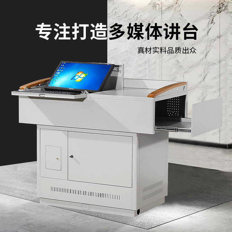 產品詳細介紹1.外形尺寸:1200*700*1000mm;上柜體:長度1200mm,寬度700,高度340mm;下柜體:長度900mm,寬度600mm,高度660mm; 2.采用1.0mm-1.2mm優質精裝冷軋鋼板,經數控激光切設備加工而成,表面酸洗、磷化、防腐、防銹、鈍化處理后靜電噴塑(顏色用戶可選定),塑面經久耐用。 3.講臺桌面采用平面設計,可以放置17-24寸不同品牌的液晶顯示器,顯示器固定在活動支架上。右前方平面可放筆記本等設備; 桌面四周半包圍結構,有效防止物品滑落; 4.講臺右側設置隱藏式抽拉展臺抽屜(長*寬*高:580*515*200 mm) 5.講臺扶手采用橡木制成,表面噴高檔防滑漆,使用起來光滑度高, 使整個講臺看起來美觀大方。 6.整體沖壓成型,整體結構緊湊,空間設計合理; 7.講臺下柜前后門均可打開,電腦主機的光驅和USB接口設有專門的可開合小門,方便放設備,后方有上下門,便于檢修設備,下門沖散熱孔,方便散熱;整個下柜可作為儲物柜使用; 8.全部的加工件均采用模具成型,激光切加工而成、配合優良的焊接工藝,保障尺寸精度及各部件一致性,保證安裝的方便快捷。 9.整個講臺采用上下分體,拼裝組成,大大的減少了運輸成本。 |