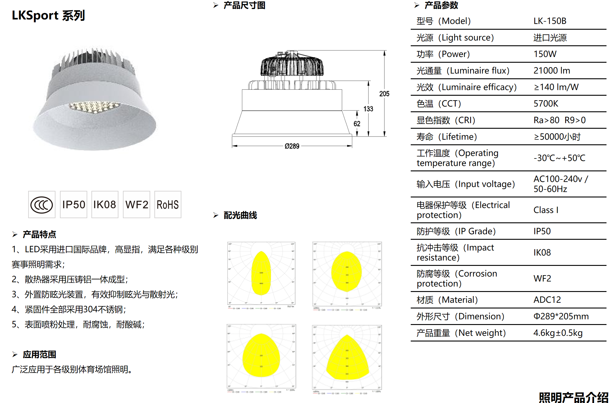產品詳細介紹1、LED采用進口國際品牌,高顯指,滿足各種級別賽事照明需求;2、散熱器采用壓鑄鋁一體成型;3、外置防眩光裝置,有效抑制眩光與散射光;4、緊固件全部采用304不銹鋼;5、表面噴粉處理,耐腐蝕,耐酸堿 型號(Model) LK-150B 光源(Light source) 進口光源 功率(Power) 150W 光通量(Luminaire flux) 21000 lm 光效(Luminaire efficacy) ≥140 lm/W 色溫(CCT) 5700K 顯色指數(CRI) Ra>80 R9>0 壽命(Lifetime) ≥50000小時 工作溫度(Operating temperature range) -30℃~+50℃ 輸入電壓(Input voltage) AC100-240v / 50-60Hz 電器保護等級(Electrical protection) Class I 防護等級(IP Grade) IP50 抗沖擊等級(Impact resistance) IK08 防腐等級(Corrosion protection) WF2 材質(Material) ADC12 外形尺寸(Dimension) Φ289*205mm 產品重量(Net weight) 4.6kg±0.5kg |