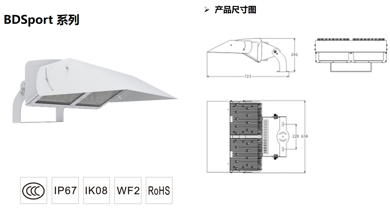 產品詳細介紹型號(Model) LK-150B 光源(Light source) 進口光源 功率(Power) 150W 光通量(Luminaire flux) 21000 lm 光效(Luminaire efficacy) ≥140 lm/W 色溫(CCT) 5700K 顯色指數(CRI) Ra>80 R9>0 壽命(Lifetime) ≥50000小時 工作溫度(Operating temperature range) -30℃~+50℃ 輸入電壓(Input voltage) AC100-240v / 50-60Hz 電器保護等級(Electrical protection) Class I 防護等級(IP Grade) IP50 抗沖擊等級(Impact resistance) IK08 防腐等級(Corrosion protection) WF2 材質(Material) ADC12 外形尺寸(Dimension) Φ289*205mm 產品重量(Net weight) 4.6kg±0.5kg產品特點 高顯指,Ra>80 R9>0,滿足各種級別賽事照明需求。 精準的防眩光外罩,進一步抵制眩光。 表面噴塑處理,耐腐蝕,耐酸堿。 燈具需使用U型安裝支架,可180°旋轉角度。 螺絲全部采用304不銹鋼。 防護等級IP67,抗沖擊等級IK08。
