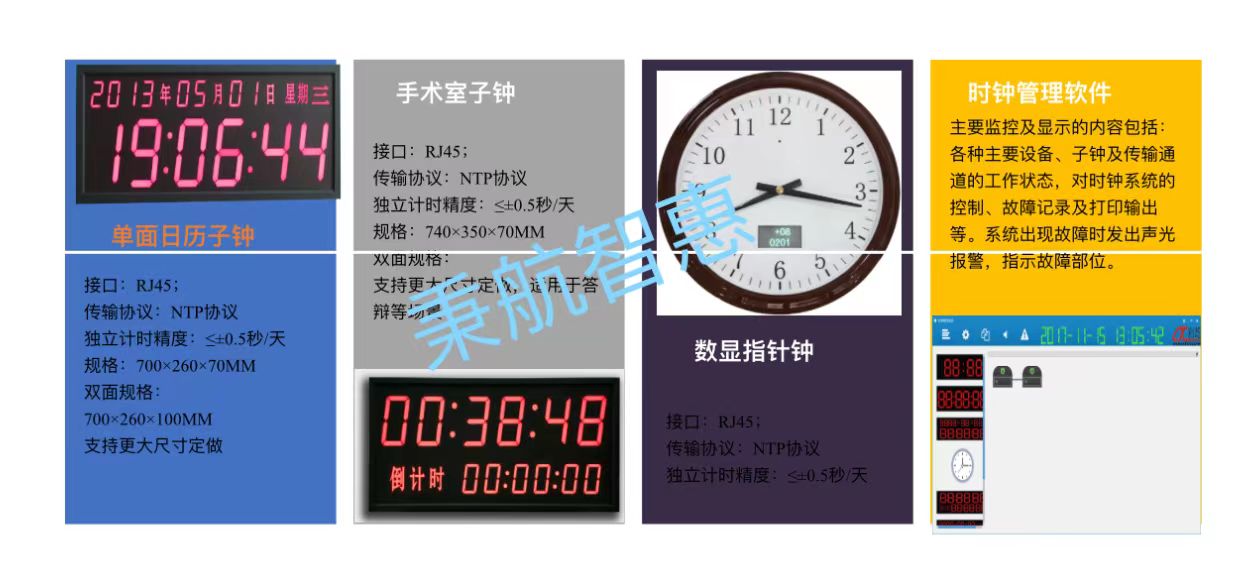 產品詳細介紹系統(tǒng)由GPS/北斗雙衛(wèi)星時間信號接收天線、中心母鐘、時鐘管理計算機、NTP服務器、電源、子鐘、及通信線路等部分組成。 NTP服務器接收中心母鐘時間同步系統(tǒng)信號且能自動消除累計誤差。網絡數字子鐘、網絡輸出接口箱、管理計算機、時鐘網管監(jiān)控系統(tǒng)、其它弱電系統(tǒng)均通過網絡獲取標準時間。 時鐘管理系統(tǒng)通過網絡與子鐘連接,實現時鐘系統(tǒng)的安全管理、告警管理、日志管理、故障管理、配置管理、狀態(tài)管理、遠程管理。能方便查看維護指南,在線幫助。設有設備維修檔案,記錄每個故障發(fā)生的具體位置、時間、類型、維修情況等。