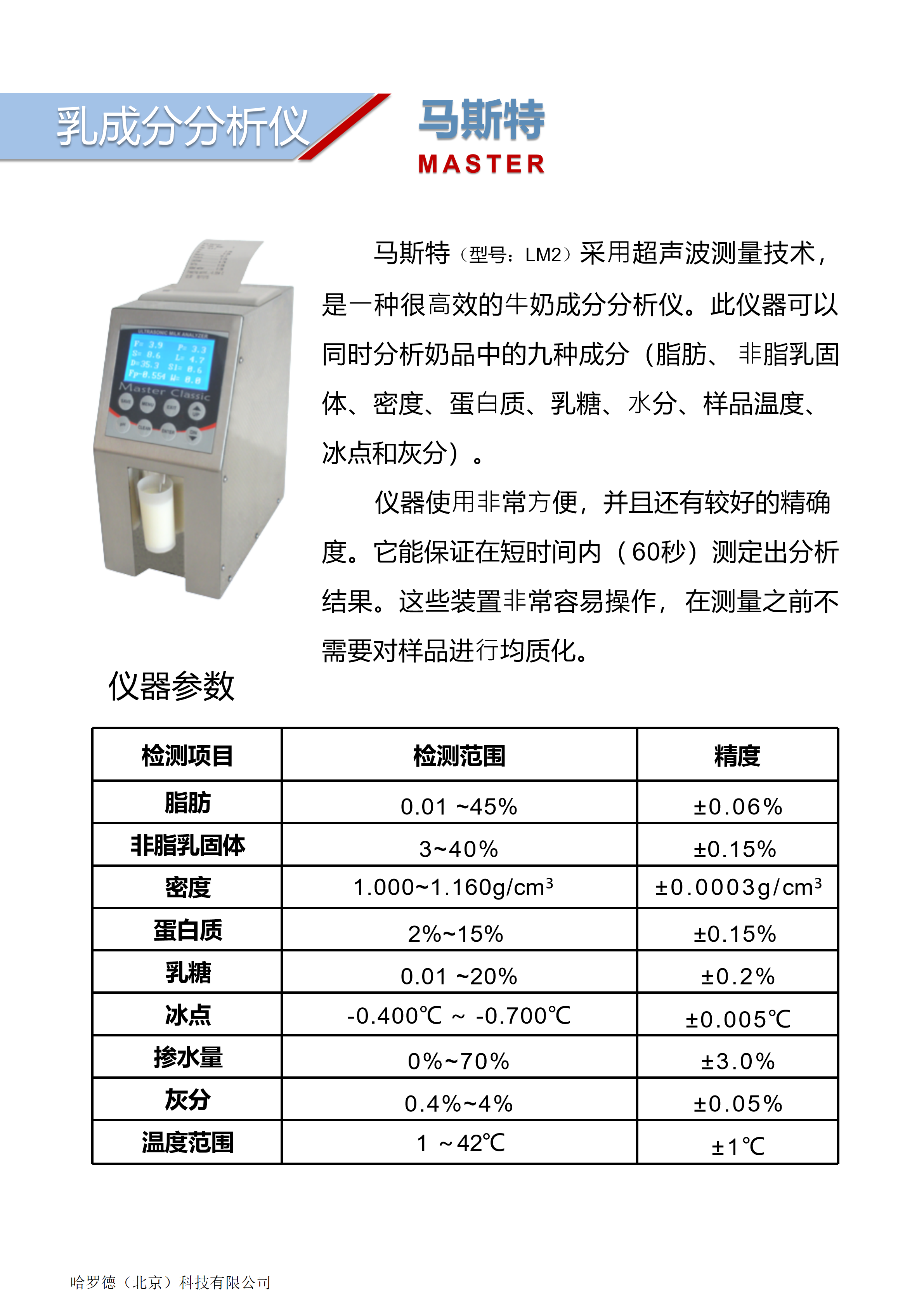 產(chǎn)品詳細(xì)介紹1、乳成分分析儀產(chǎn)品特點(diǎn): 1.1高準(zhǔn)確性和性,采用的聲波檢測(cè)技術(shù) 1.2安裝操作維護(hù)校正方便簡(jiǎn)單 1.3中/英文可切換操作界面。 1.4測(cè)量快速,檢測(cè)時(shí)間為每個(gè)樣品60SEC(≥60個(gè)樣品/小時(shí)) 1.5便攜,緊湊的設(shè)計(jì),車載電源加上的便攜箱配備,可實(shí)現(xiàn)儀器固定或移動(dòng)的轉(zhuǎn)換使用 1.6清洗容易,可實(shí)現(xiàn)自動(dòng)化清洗,一鍵式操作 1.7內(nèi)置,外置打印機(jī)可選,同步記錄數(shù)據(jù) 1.8儀器自帶存儲(chǔ)功能,可存儲(chǔ)500組檢測(cè)數(shù)據(jù) 1.9標(biāo)準(zhǔn)232接口,方便與計(jì)算機(jī)連接。 2、乳成分分析儀服務(wù)與支持: 2.1 便攜箱和熱敏打印機(jī) 2.2 技術(shù)團(tuán)隊(duì)支持售前售后服務(wù) 2.3一年保修 3、乳成分分析儀技術(shù)指標(biāo): 檢 測(cè) 項(xiàng) 目 單位 檢 測(cè) 范 圍 精 度 脂肪 % 0.01 ~ 45 ±0.06 非脂乳固體 % 3 ~ 40 ±0.15 密度 kg/m3 1.000 ~ 1.160 ±0.0003 蛋白質(zhì) % 2 ~ 15 ±0.15 乳糖 % 0.01 ~ 20 ±0.2 含水量 % 0 ~ 70 ±3.0 樣品溫度 ℃ 1 ~ 42 ±1 冰點(diǎn) ℃ -0.400~ -0.700 ±0.005 灰份 % 0.4 ~ 4 ±0.05 4、環(huán)境條件: 4.1空氣溫度:10℃ ~ 40℃ 4.2牛奶溫度:1℃~40℃ 4.3相對(duì)濕度:30%~80% 4.4功耗:30w 4.5尺寸(W×D ×H): 100x223x216mm 4.6重量:< 2.5公斤 |