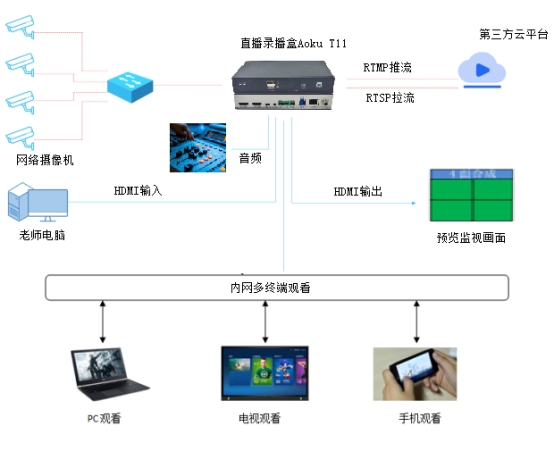 北極星通公司依托 15 年流媒體技術積累,推出Aoku T11 直播錄播盒: ✓ 極簡部署:單臺 T11 直播錄播盒接入校園網絡,即可實現: 利舊現有網絡攝像機 / 調音臺等設備,支持 1080P 60fps 高清編碼,自動生成直播二維碼 / 鏈接,多終端同步觀看(支持 200 + 并發) ✓ 安全可控: 支持校園網內外網隔離部署 ✓ 智能歸檔: 自動生成標準格式視頻文件 支持按標簽分類存儲 提供 API 接口對接校園資源平臺 典型應用場景: ・專家講座:實時直播 + 在線互動 + 視頻存檔 ・精品課程:多機位錄制 + 智能剪輯 + 資源共享 ・大型活動:多會場聯動 + 在線投票 + 實時彈幕 ・應急指揮:多路監控畫面融合直播