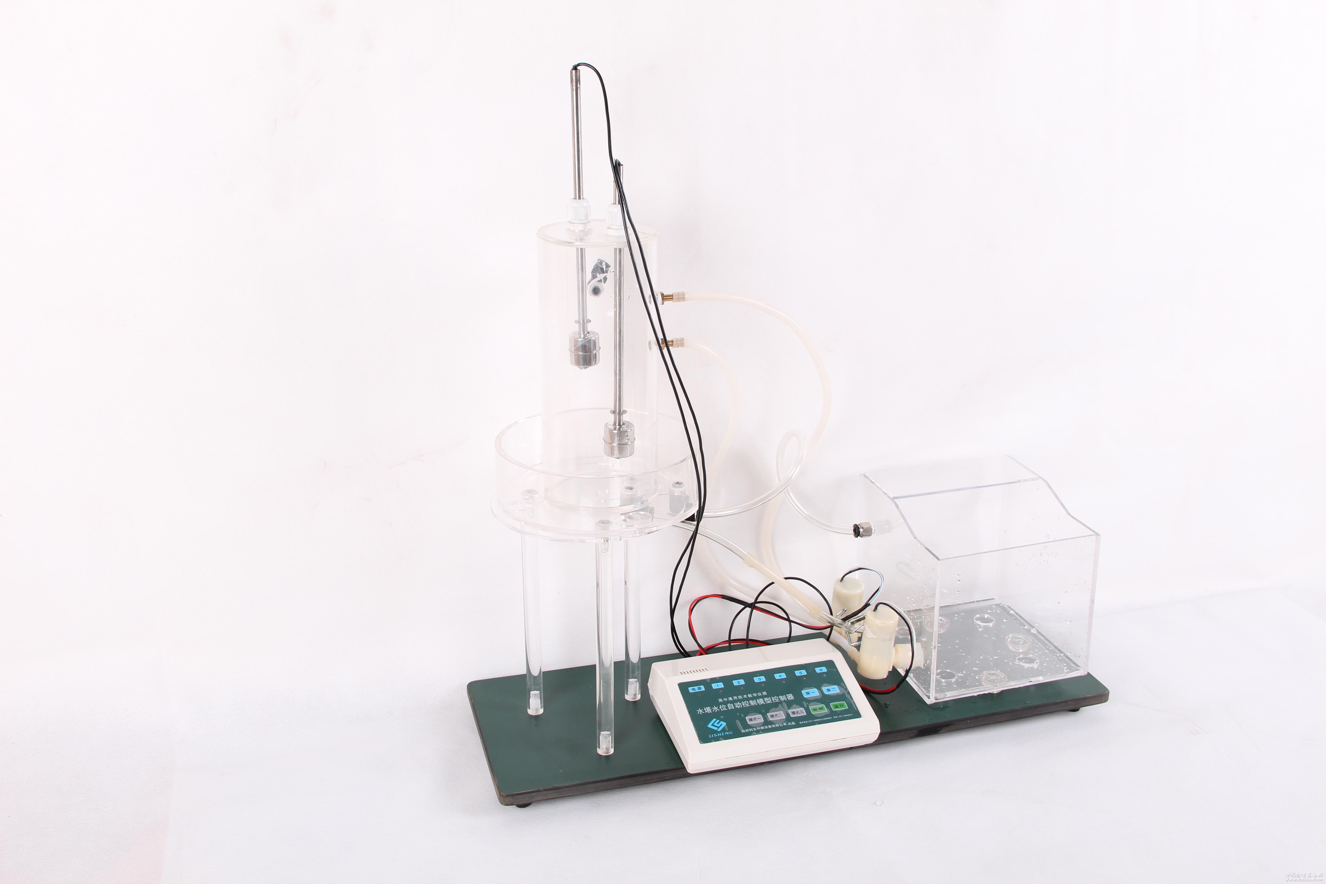 產品由上水箱、下水箱、水位傳感器,水泵,6V∕2A電源,快速接頭,透明水管、水箱、支柱、水箱托盤、控制器導線等組成,水箱、水箱托盤、水箱支柱均用亞克力透明材料制成,上水箱應有防溢水裝置,雙水泵可以各自獨立控制供水,還可延時控制供水及自動循環供水,具備單、雙傳感器多種自動控制