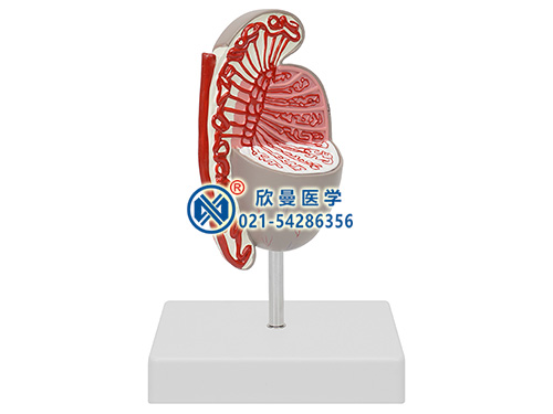 XM-716睪丸解剖放大模型顯示睪丸、附睪及輸精管,睪丸作剖面,在剖面上顯示睪丸白膜、睪丸小隔、鞘膜腔、睪丸小葉、精曲小管、附睪頭、睪丸輸出小管、附睪管、睪丸網、附睪體、附睪尾等外形。