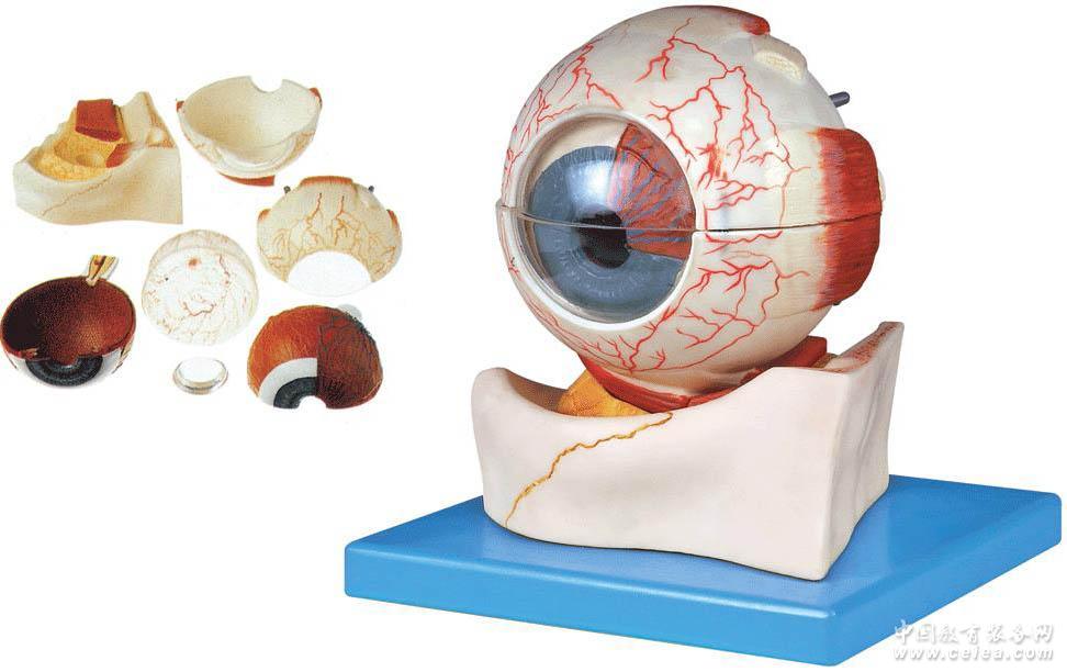 ■ 該模型在上頜骨上方將眼球水平切,由眼球壁鞏膜、脈絡膜上、下半側、角膜、晶狀體和玻璃體等7個部件組成,并顯示眼球壁鞏膜、角膜、虹膜、睫狀體、脈絡膜和視網膜的構造以及眼球內容物、眼球外肌、血管和神經等結構,共有31個部位指示標志。