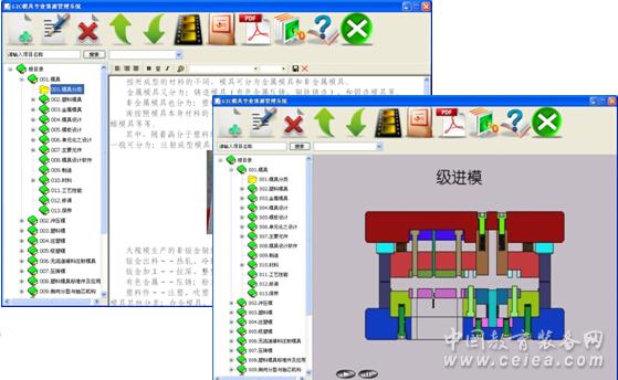豐富的模具教學(xué)資源 系統(tǒng)包含豐富的模具教學(xué)資源,包含模具基本概念、模具制造、模具設(shè)計(jì)、典型模具的裝配與調(diào)整等多方面專業(yè)知識(shí)的教學(xué)資源。 |