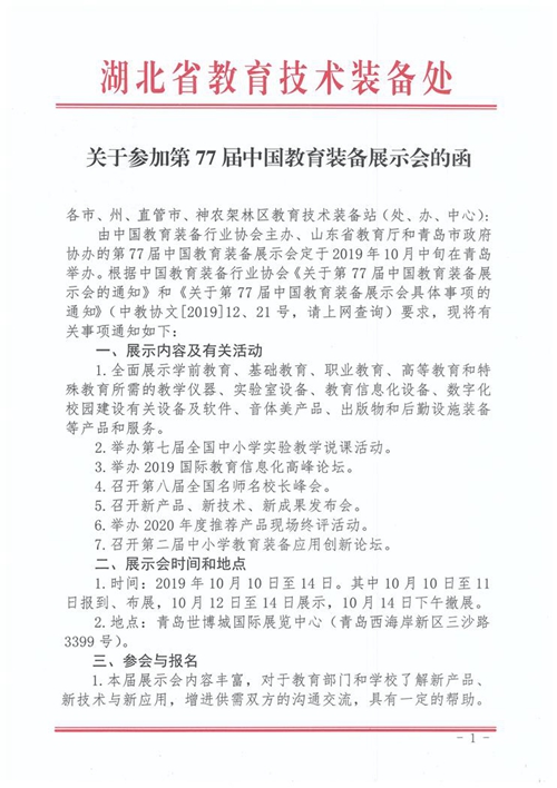 | 湖北省教育技術裝備處關于參加第77屆中國教育裝備展示會的函 |