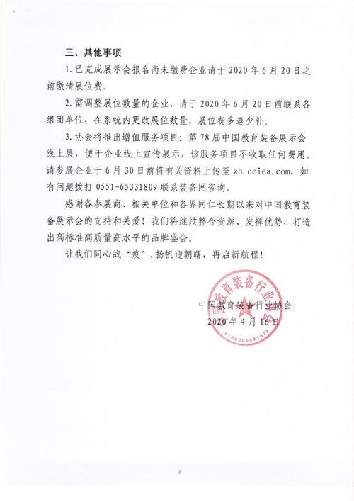 3.協會將推出增值服務項目:第78屆中國教育裝備展示會線上展,便于企業線上宣傳展示,該服務項目不收取任何費用。請參展企業于6月30日前將有關資料上傳至zh.ceiea.com,如有問題撥打0551-65331809聯系裝備網咨詢。