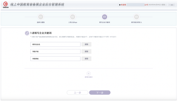 2.填報企業簡介為方便搜索,提高展示效果,請填報企業簡介,并上傳企業Logo。3. 填報企業關鍵詞請準確填報企業關鍵詞,關鍵詞不超過6個,每個詞條不超過12個字符。