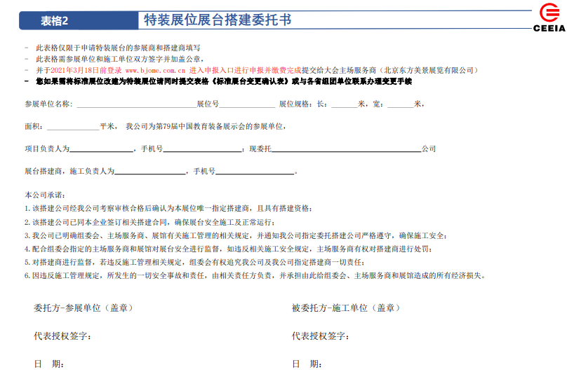 請參展商通知各自的搭建單位務必于2021年3月18日17:00前與北京東方美景展覽有限公司聯系辦理施工申請手續,交納相關費用。逾期未辦理申報手續,將產生滯納費用,詳見各附表。